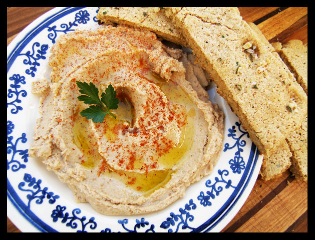 Classic white bean hummus with olive oil and crusty bread.